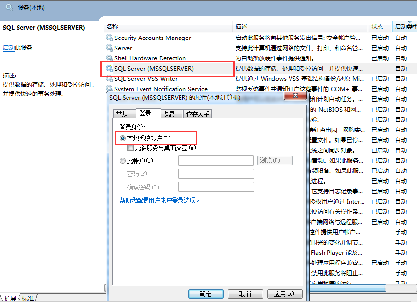 请进入 控制面板->服务 找到 ”SQL Server(MSSQLSERVER)“的服务,双击打开属性设置。