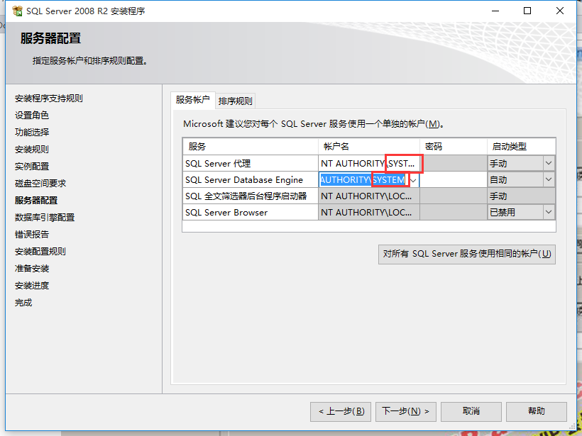 出现这种情况这是因为安装SQL Server 2008 R2 时,服务帐户的登录身份选择了 “NETWORK_SERVICE" (网络服务)(如果选择SYSTEM则不会出现些问题,如图)